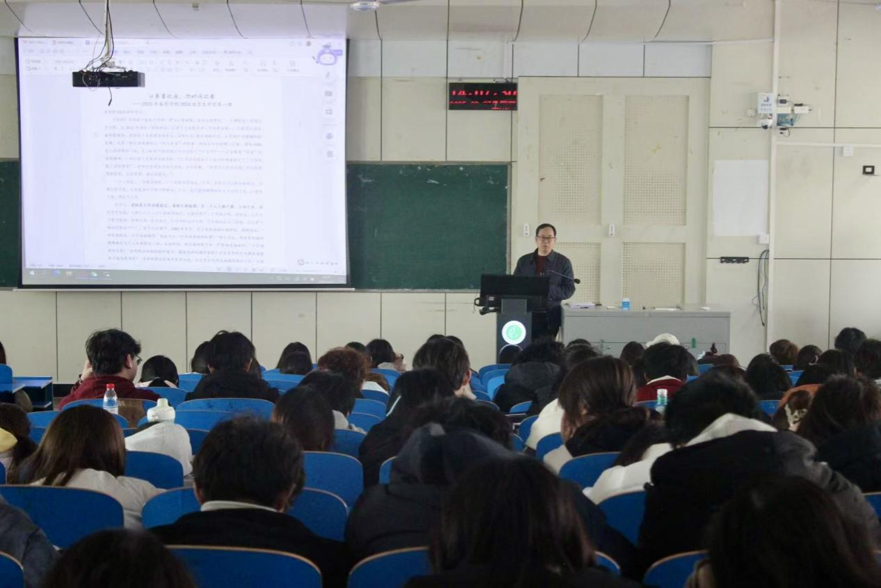2月27日,艺术计公司党委书记张运生在教学楼2206教室为24级同学讲授思政课。