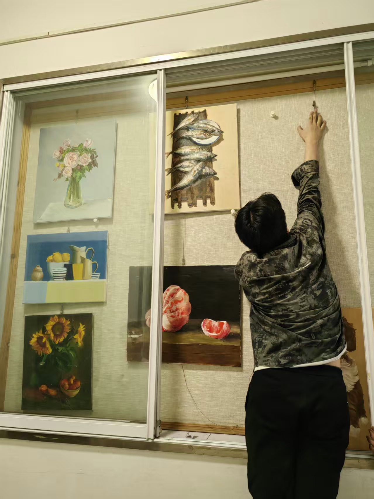 “这次作业展是对我们阶段性学习的一次重要检验。”一位参展同学表示,“通过静物写生与创作,我们不仅锻炼了‘手头功夫’,更重要的是学会了如何‘观看’和‘思考’,如何在平凡的静物中发现形式之美与情感共鸣。”指导老师闫萍在观展时评价道:“同学们展现出了良好的学习态度和艺术潜力。从作品中可以看到他们对油画材料的驾驭能力在提升,对画面整体氛围的营造也有了更深的体会。部分作品在构图立意、色彩表现或笔触语言上已初具个人面貌,令人欣喜。这次展览是起点,希望他们继续保持对绘画的热爱与探索精神。”
