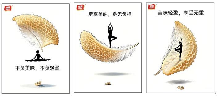 创意思想:围绕“魔芋金钱肚”的“健康平替”属性,用反差感视觉和精准符号传递核心价值:食材反差破圈:把“魔芋(低卡健康)”和“金钱肚(传统荤食)”结合,通过“蜂巢纹理(金钱肚形态)+羽毛(魔芋轻量)”的视觉融合,直接打消“吃肚类有负担”的顾虑,点明“口感像荤食,身体无负担”的产品优势;情绪价值精准触达:用瑜伽/舞蹈人体的舒展姿态,呼应年轻人“嘴馋想吃、又怕热量”的饮食纠结——魔芋金钱肚既能满足对“传统美味”的渴望,又能让身体保持轻盈,传递“不用克制,轻松享受”的愉悦感;记忆点强化:名称里“肚造”谐音“独到”,突出产品是“用魔芋造出的美味金钱肚”;“轻羽无腹担”既对应画面羽毛元素,又点出“低卡无负担”的核心卖点,让产品定位与年轻消费群体的健康需求强绑定。