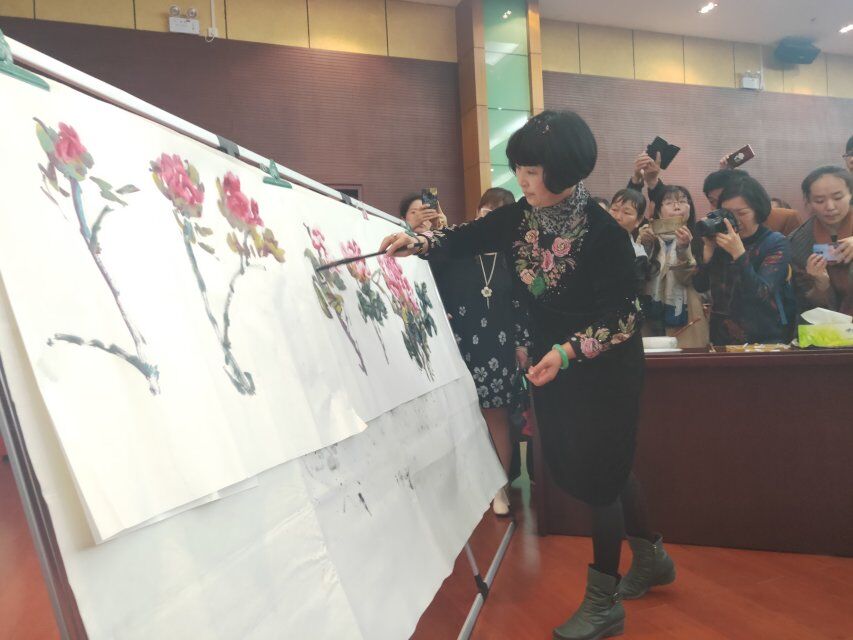 讲座伊始,主讲人刘元红就牡丹的技法、牡丹的悠久历史文化、牡丹的象征三个方面主要进行讲解,着重提到牡丹文化历史悠久,不仅走进人们的生活,还走进校园之内。其后,刘元红画家用中西合璧的方法当场为同学们展示绘画牡丹,刘元红老师技法高超,一挥而就,同学们积极的与老师互动,场面十分活跃。随后,刘元红画家说到,艺术应该在古书中汲取精华,艺术是美学,美学是哲学。