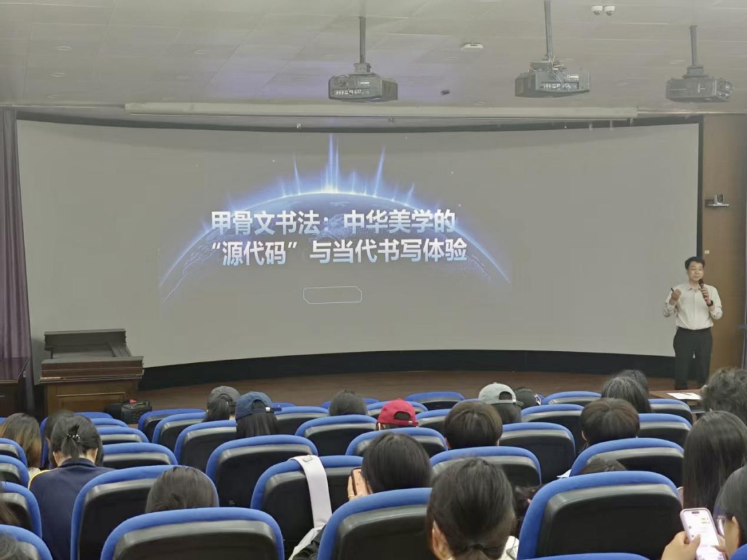 讲座中,刘斐以深入浅出的方式,系统梳理了中华美学的源流与发展脉络,他从甲骨文书法演变、绘画的起源讲起,一直延伸至现代数字艺术的创新实践,详细解读了中华美学的“源代码”。刘斐指出,中华美学不仅是一种艺术形式,更是一种文化传承与精神追求的载体。随后,刘斐通过丰富而生动的实例,向同学们展示了中华美学在当代书写体验中的应用与创新,并特别强调了当代书写体验的重要性。