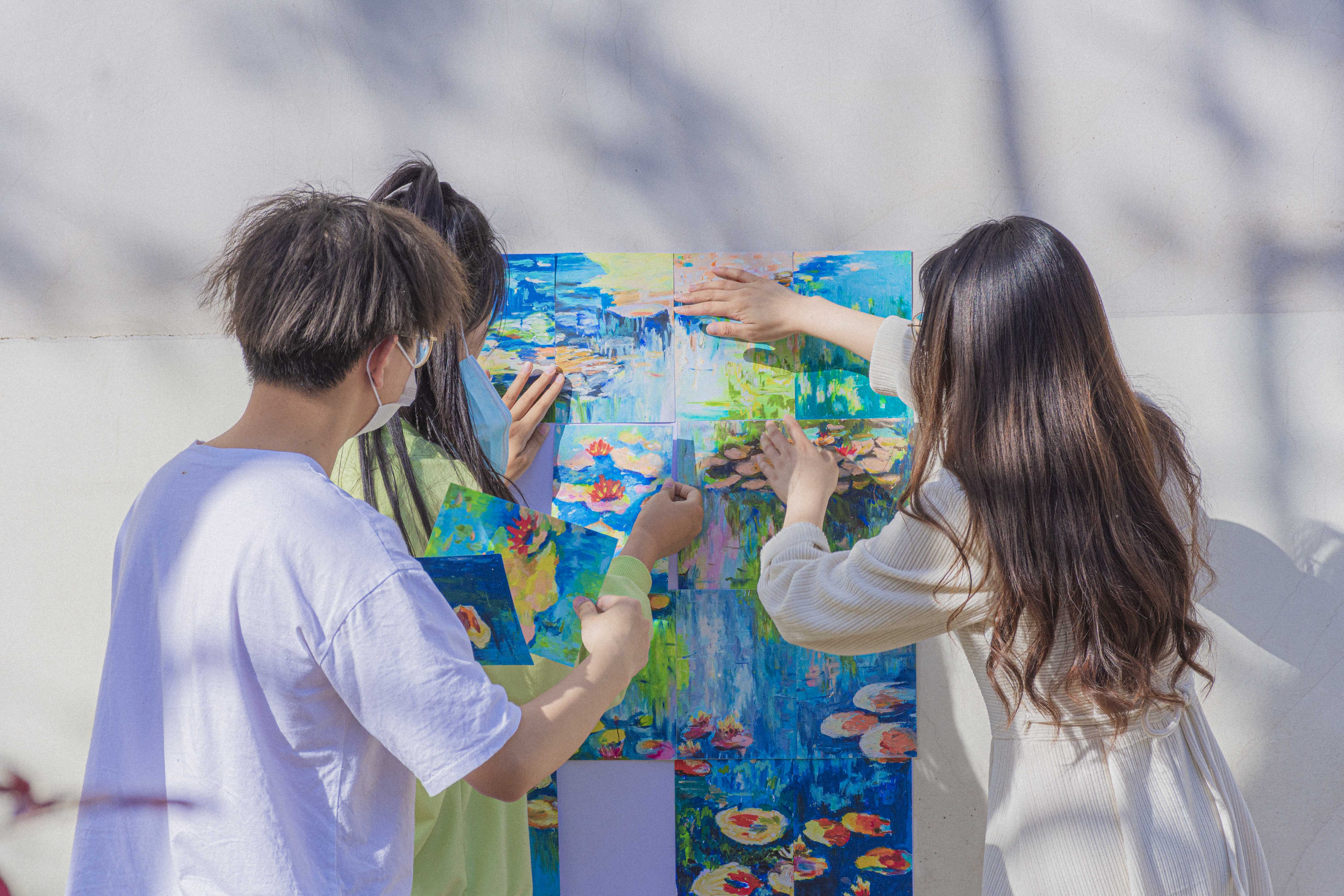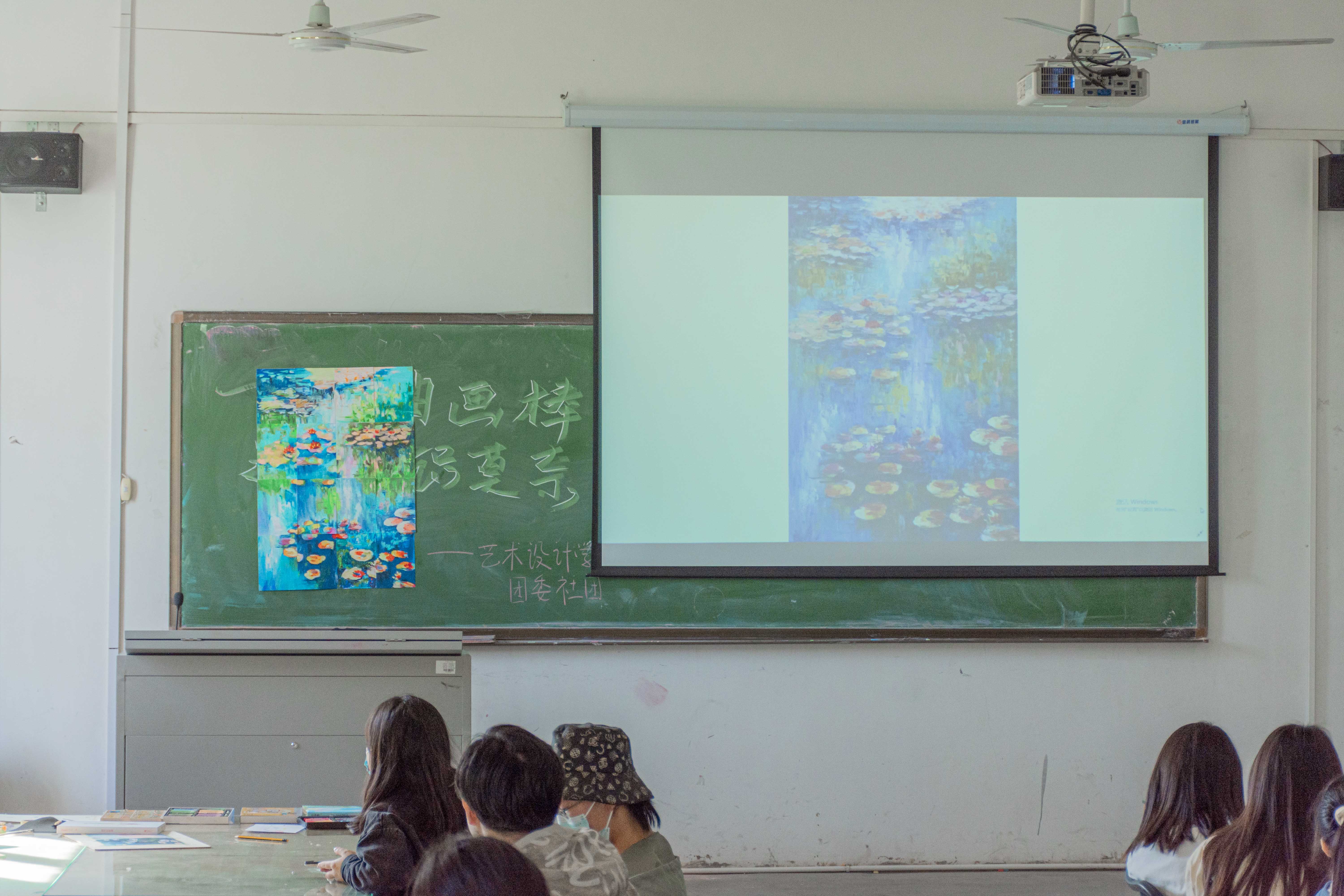 活动伊始,由社团负责人带领同学先提前熟悉绘画方法及作品规格,以便同学们能够更好的参与到此次系列活动。接着,讲解员根据活动主题,为同学们讲解需要用到的相关的工具以及表现手法等等,在场“画家”们都全情投入,用笔更用心感受创作的美好,仿佛能让人感受到片片睡莲在水中的宁静,即使是画布也裹不住这恰意的清新。最后,负责人还向大家展示了学长学姐们的部分优秀作品,让大家体会独特的肌理绘画方式带来的有趣的画面效果。