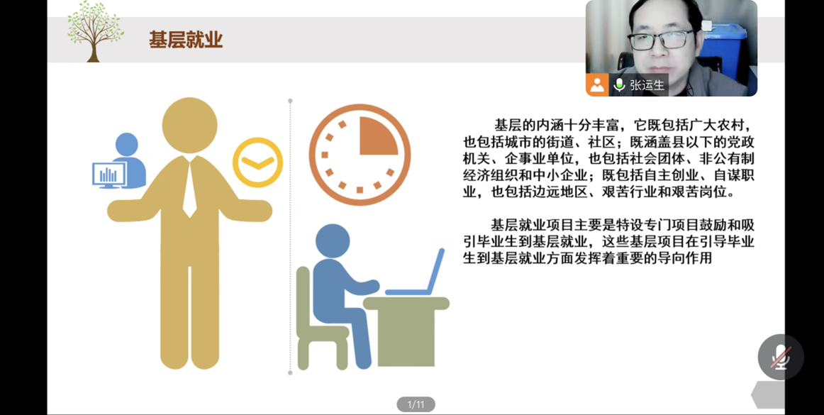 张运生首先分析了近年高校毕业生的就业形势,提出了老员工面临的就业问题并鼓励老员工认清当前就业形势、树立正确的就业观、择业观。其次,为同学们讲述了就业协议书的签订等注意事项。最后,给同学们提了几点建议,鼓励同学们在未来的就业、生活和工作中不断进行规划,设定合理的目标,成就美好的人生。