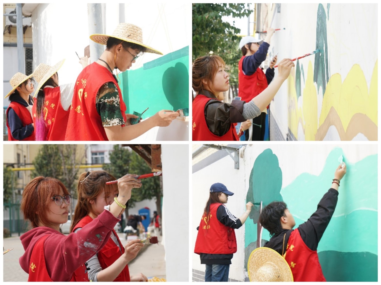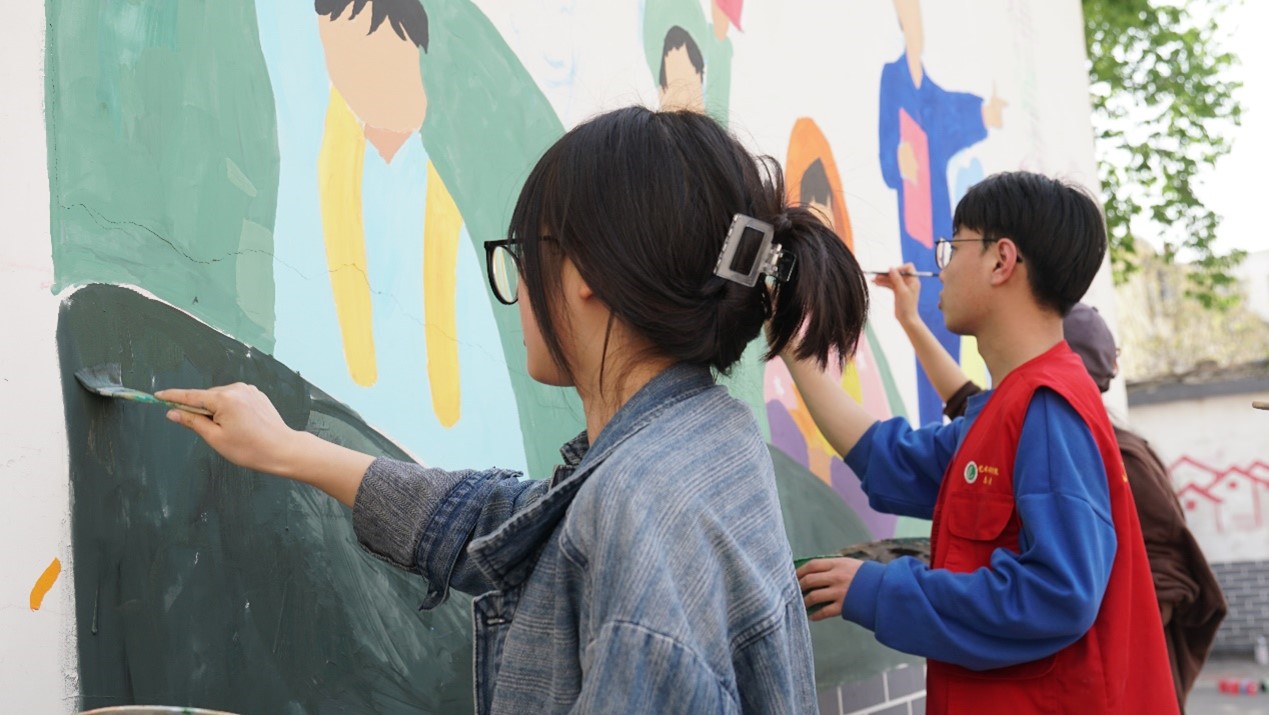 在活动现场,每位同学分工明确,认真完成岗位职责,将自己的专业知识和奉献精神融入墙绘之中。他们手拿刷子、画笔等工具,经过起形描边、调色上色、再到最后的清洁工作都表现出了极大的耐心和认真,做到每一个步骤不马虎、每一个图形都精益求精、力求完美。