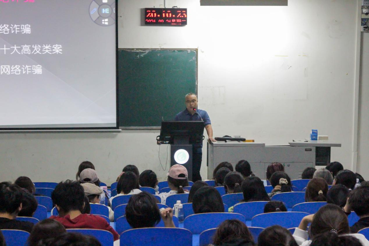 任高举围绕电信网络诈骗的高发类案与防骗技巧进行讲解。通过案例分析揭露电诈手段,引导新生认清电诈本质,掌握“六个一律”与“八个凡是”的防骗原则。他的报告让同学们深刻认识到电诈的危害性和防范电诈的重要性,助力新生增强防骗意识,远离诈骗陷阱,共筑安全防线。