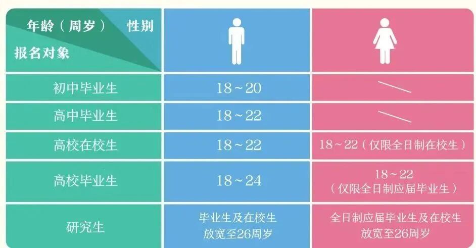 注:2024年普通高等公司全日制本专科应届毕业生可以报名参加2025年上半年女兵征集,年龄放宽至23周岁。