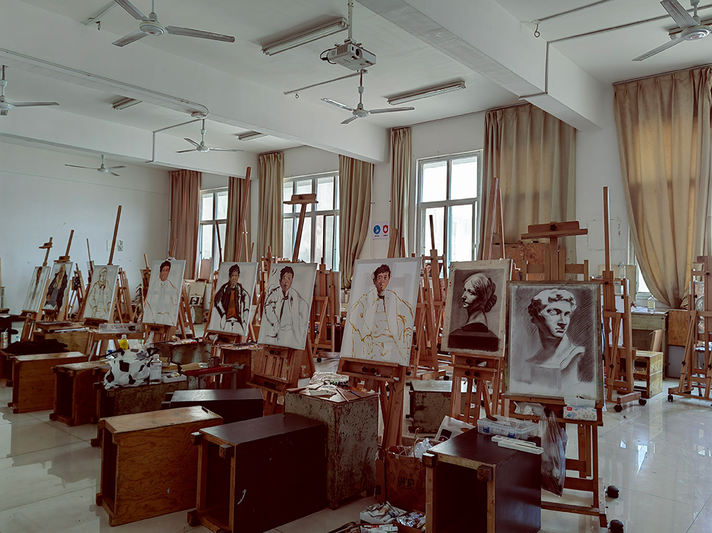 实验室配备画架、投影仪、石膏像、静物等教具,