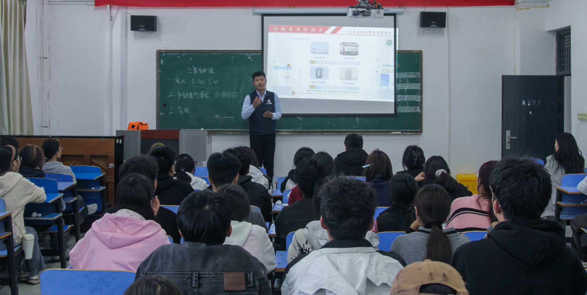 张教员先列举了南方科技大学实验室安全事故、家用酒精炉添加酒精时发生爆炸、家里电动车充电时发生爆炸三起爆炸事故,问同学们“火灾发生该怎么办?”,听完大家的回答后,张教员告诉大家“报警-灭火—逃生”火灾处理三步骤。通过播放火灾逃生视频和2015年郑州关虎屯事件,告诉同学们火灾逃生时低层用湿毛巾捂口鼻,四层以上楼房逃生用防毒面具,并现场讲解了防毒面具的使用方法。“如何灭火呢?”要灭初期火,张教员以一四口之家火灾的惨痛教训为例做了讲解。并现场讲解了干粉灭火器使用方法“摇、拔、喷”。最后张教员以许昌市光明路一起火灾和一厨房油锅起火为例,讲解了灭火毯的用途、特点和使用方法。张教员的讲座最后在同学们热烈的掌声中结束。